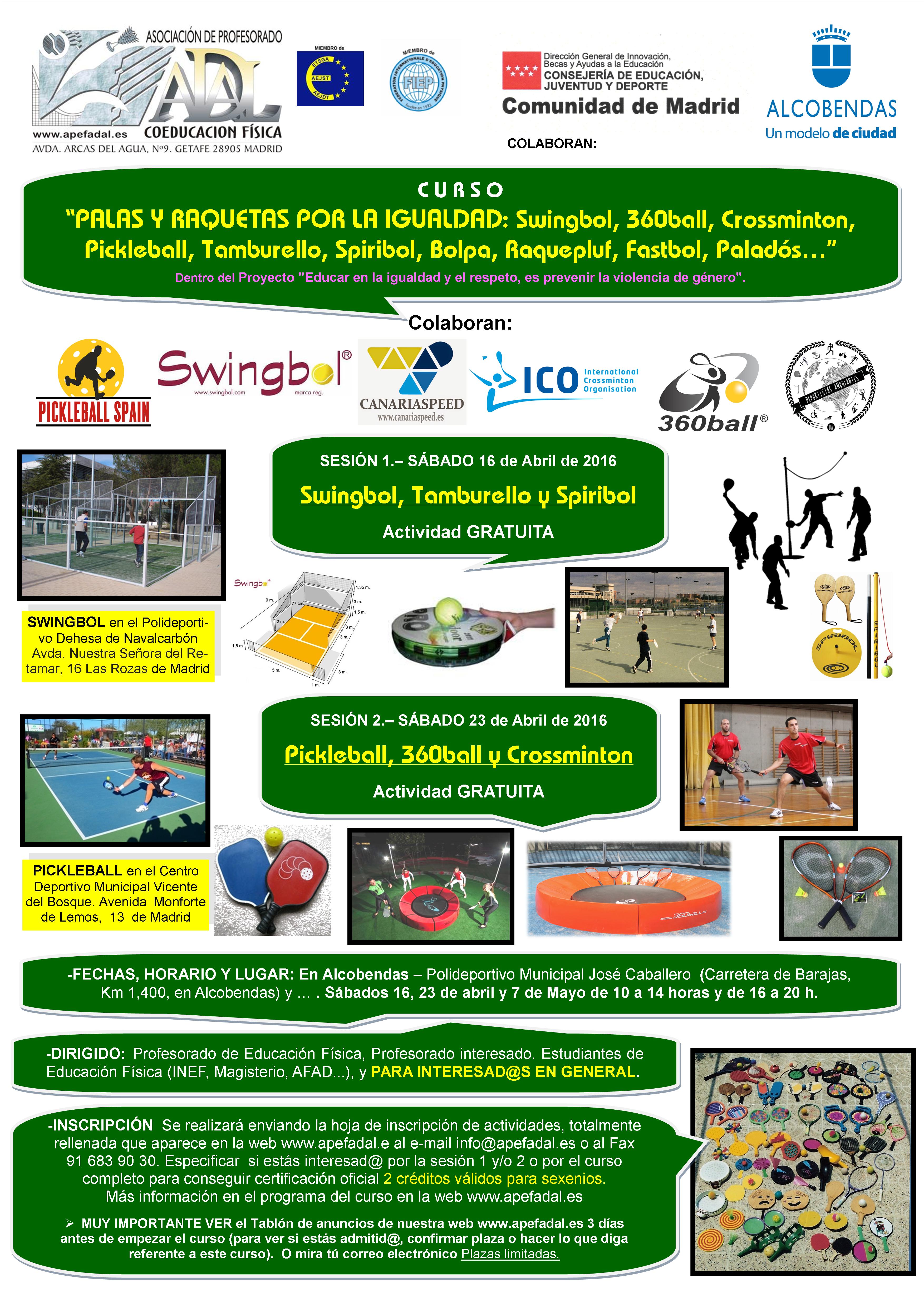 Curso de «PALAS Y RAQUETAS POR LA IGUALDAD»: Swingbol, 360ball, Crossminton, Pickleball, Tamburello, Spiribol, Bolpa, Raquepluf, PalaTriVolle, PalaTriVolle, Paladós…” Dentro del Proyecto «Educar en la igualdad y el respeto, es prevenir la violencia de género».